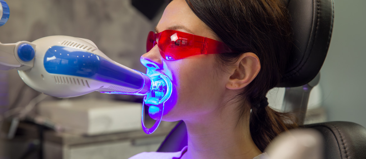 歯科医院にて行うホワイトニングです。専用の薬剤を歯の表面に塗り、光を照射して歯を白くしていきます。